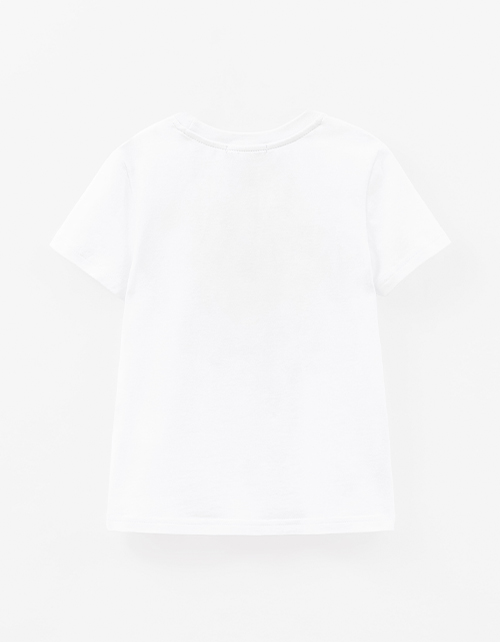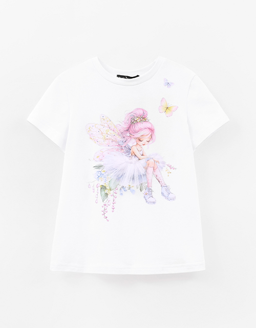 Белая футболка для девочки. Прямой силуэт обеспечивает комфорт. Короткий рукав и эластичная горловина из рибаны формируют аккуратную посадку. Цифровой принт дополнен стразами и отлётным декоративным элементом из фатина.