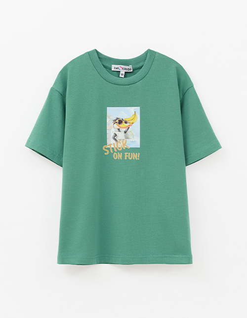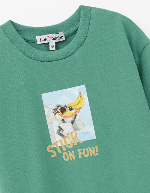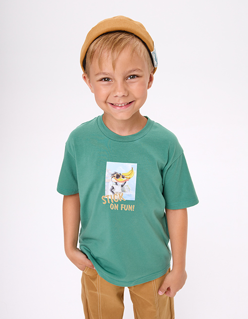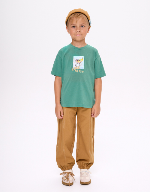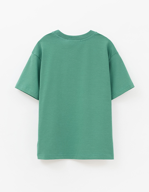 Тёмно-зелёная футболка для мальчика. Прямой силуэт обеспечивает комфорт. Короткий рукав и эластичная горловина из рибаны формируют аккуратную посадку. Авторский цифровой принт дополнен трансферной плёнкой.