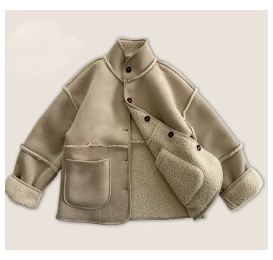 Двустороння куртка-дубленка для девочки подростка и взрослого. Стильная модель свободного кроя со спущенной линией плеча и открытыми срезами швов. Отлично сочетается с джинсами и худи, костюмами.