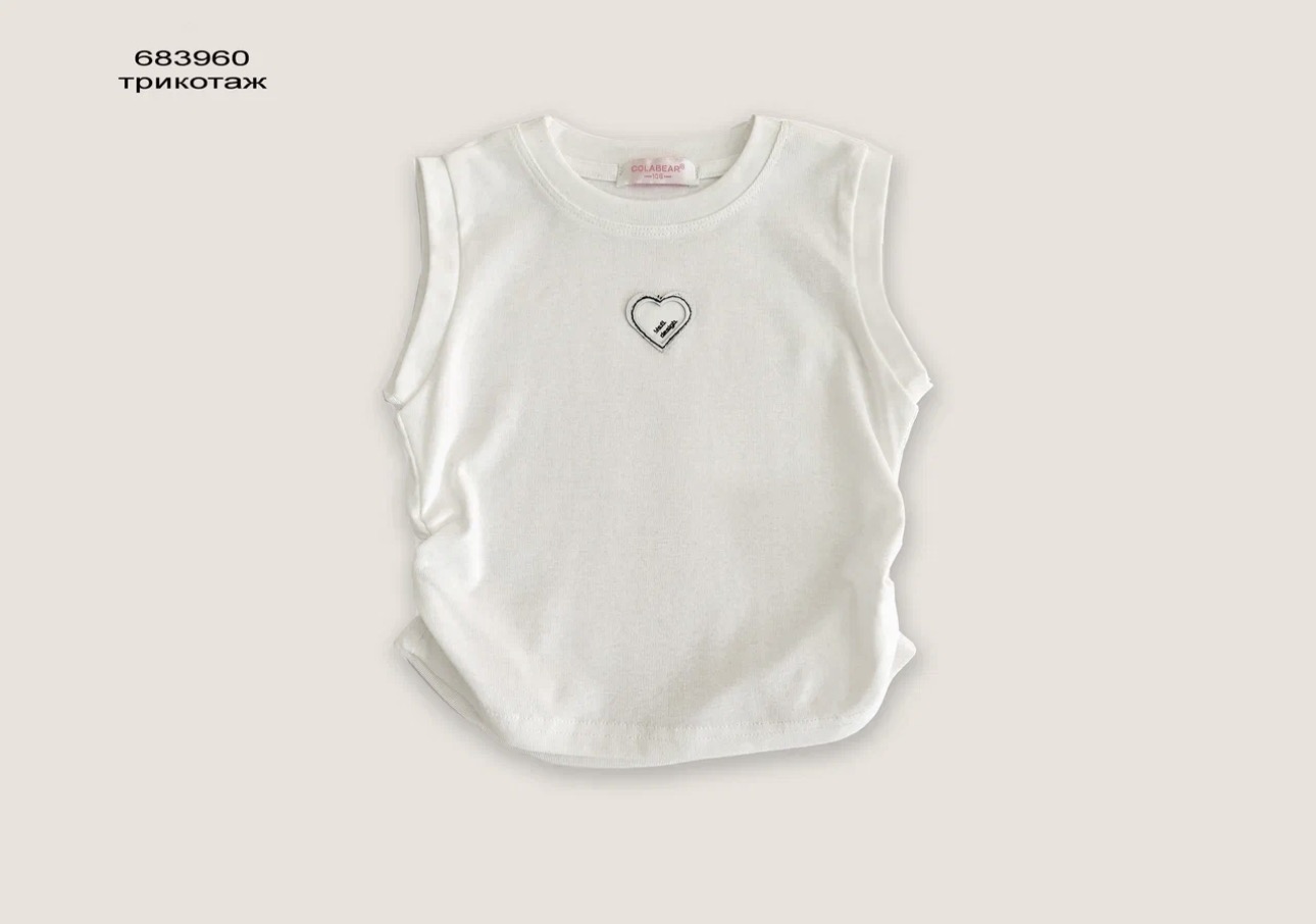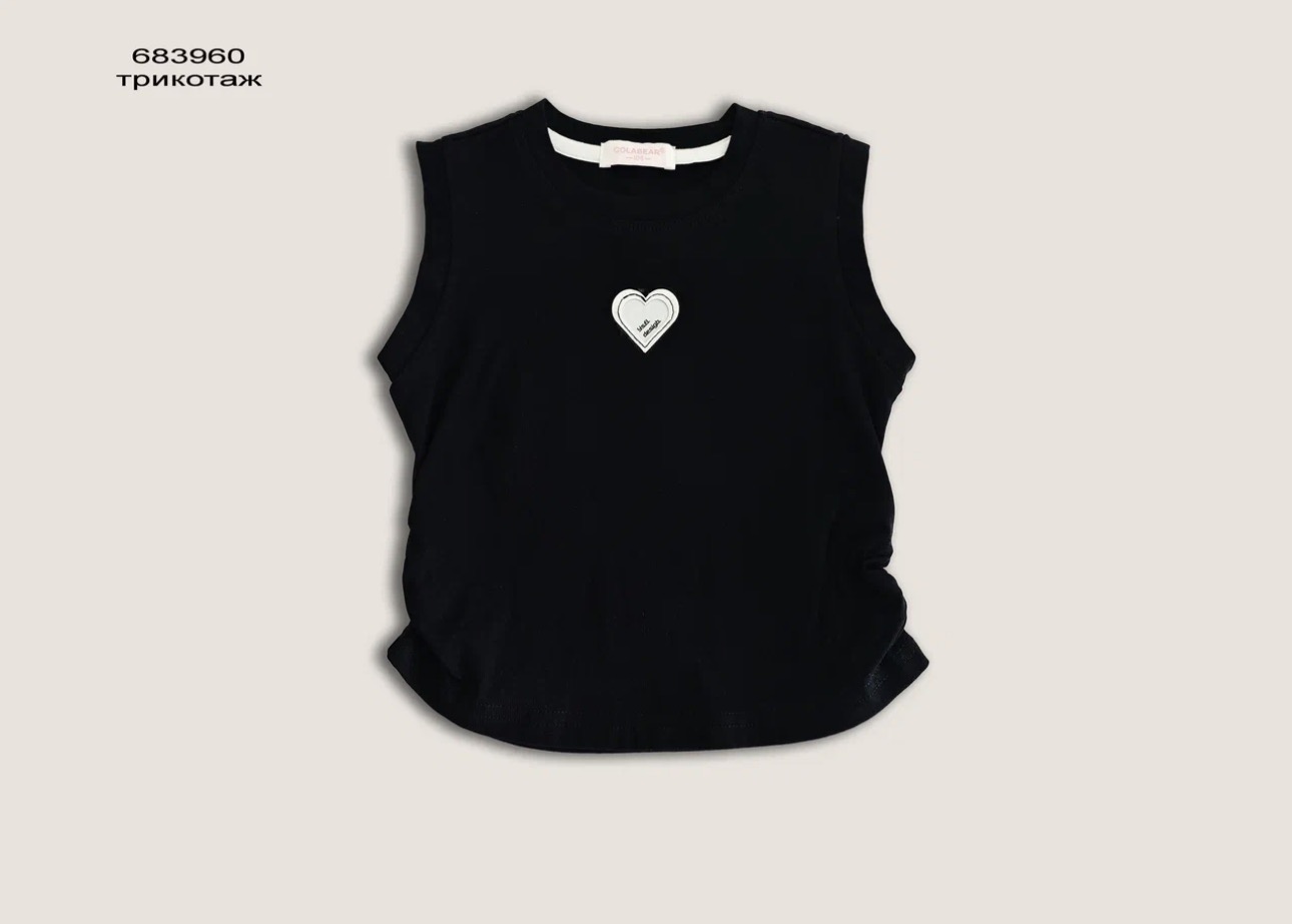 Трикотажная майка с ярким акцентом ввиде нашивки "сердце". Модель приталенного силуэта со сборкой по боковым швам. Отлиный вариант под любой низ, базовая модель создания нарядных и повседневных образов.