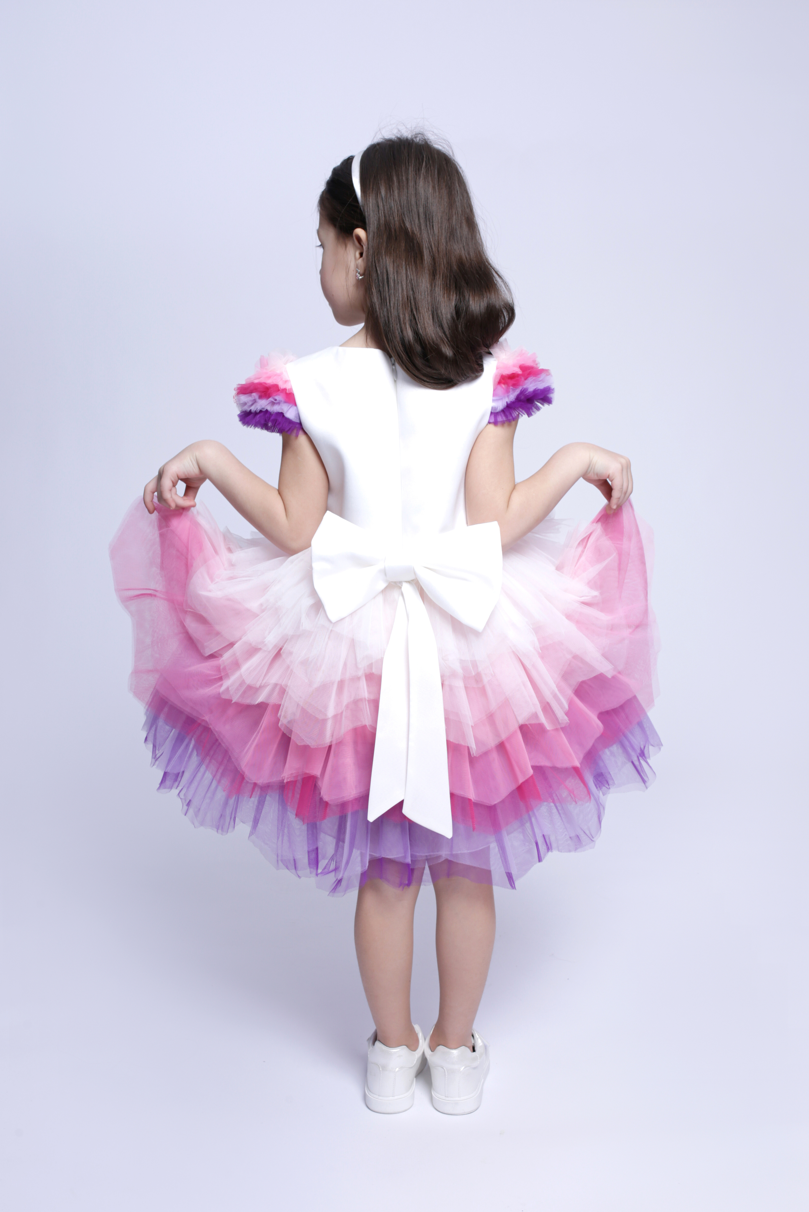 Нарядное платье для девочки от турецкого бренда Pamina выполнено из мягкого многослойного фатина. Платье на хлопковой подкладке, на полочке стразы. По талии притачной пояс с готовым бантом сзади. В комплекте ободок.