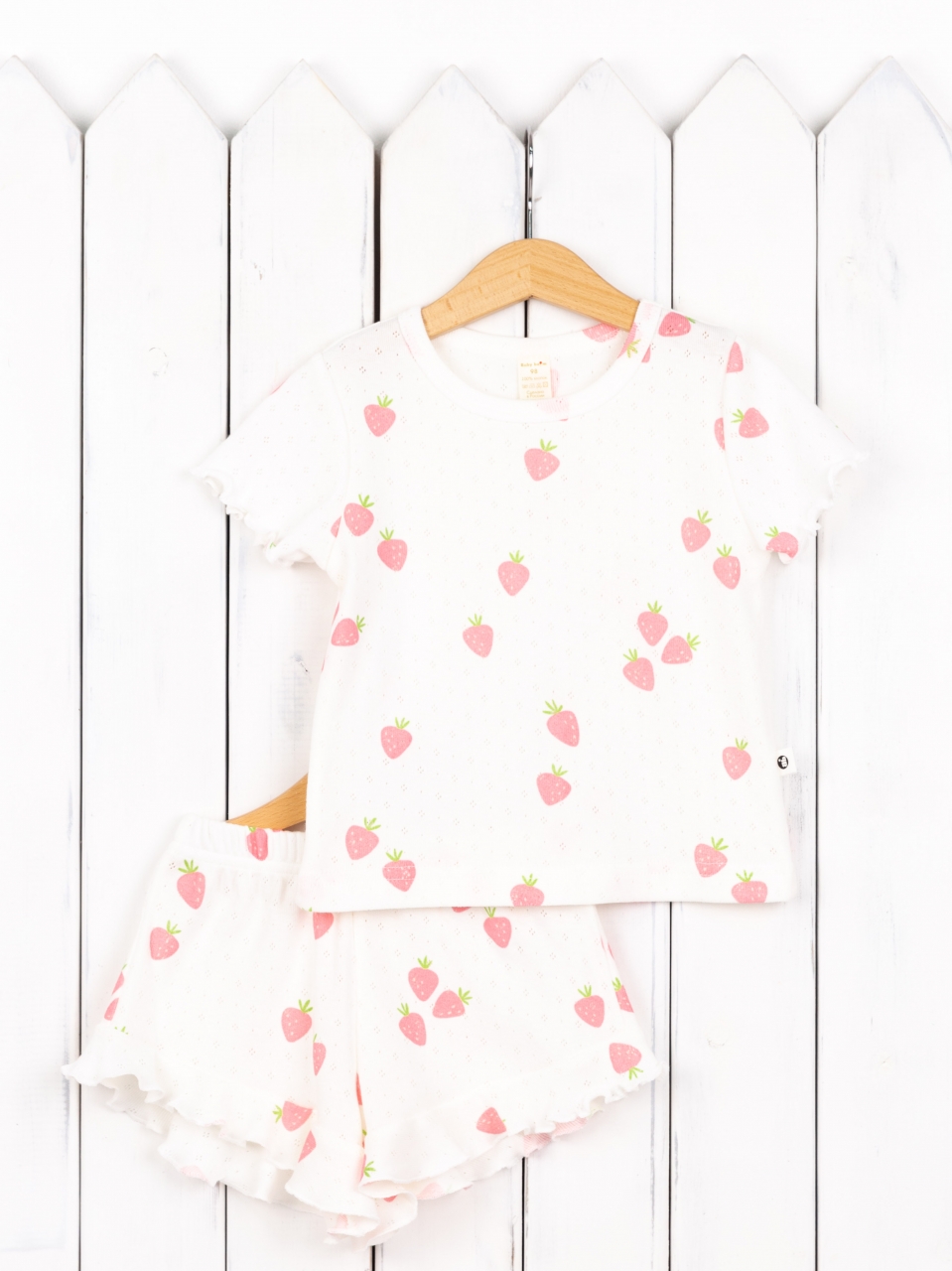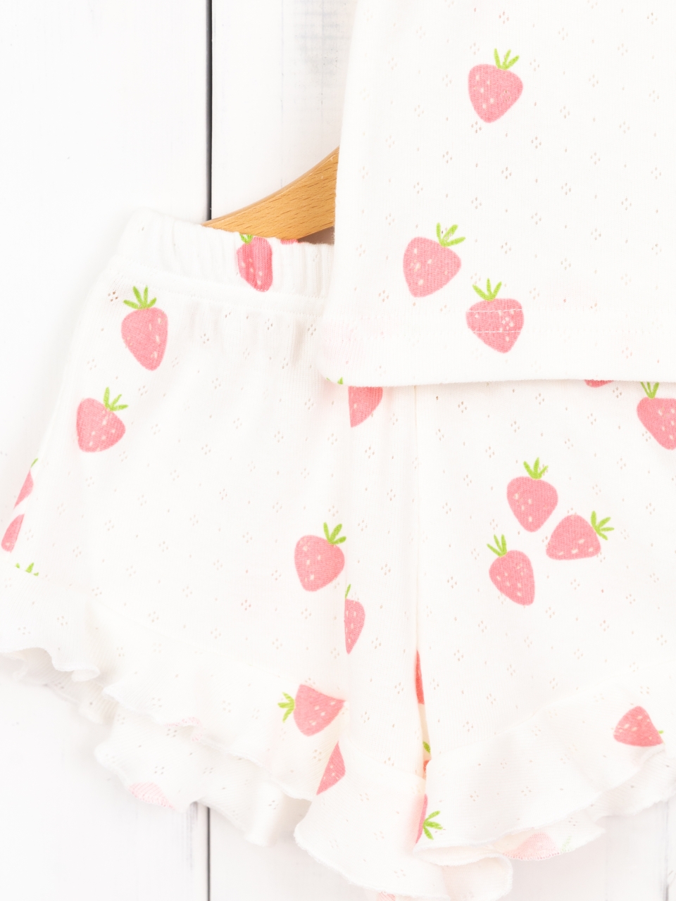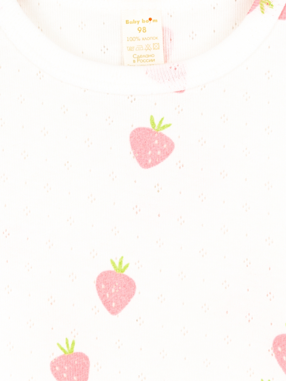 Пижама состоит из футболки и шорт с рюшами на мягкой резинке, обеспечивающих максимальный комфорт во время сна или отдыха. Выполнена из нежной ажурной рибаны с принтом (100% хлопок).