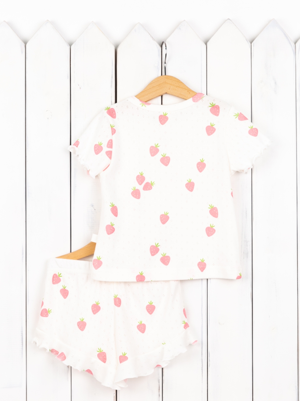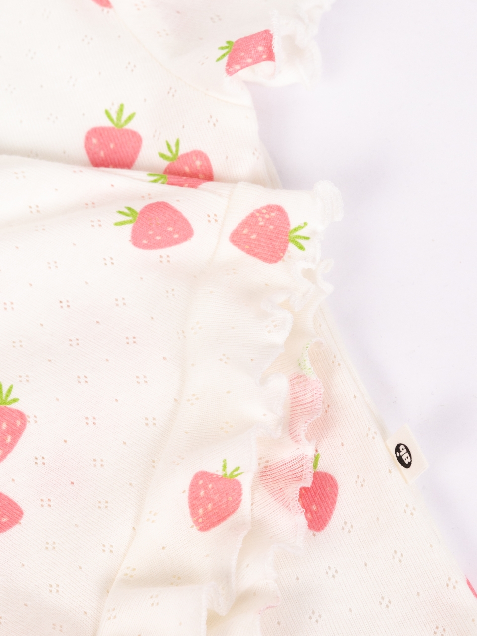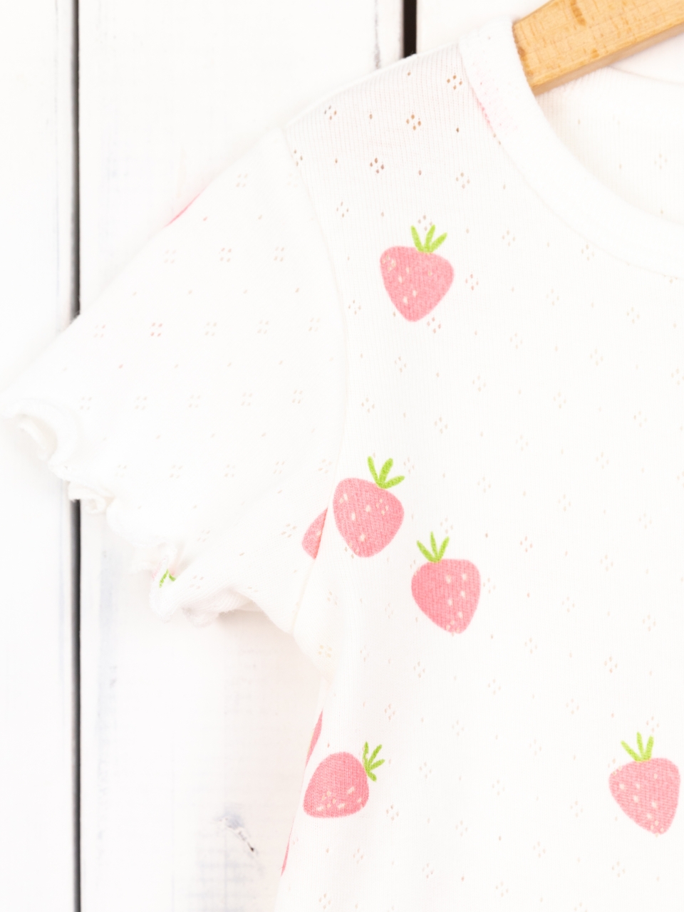 Пижама состоит из футболки и шорт с рюшами на мягкой резинке, обеспечивающих максимальный комфорт во время сна или отдыха. Выполнена из нежной ажурной рибаны с принтом (100% хлопок).