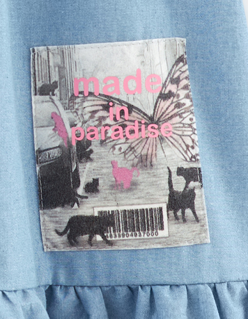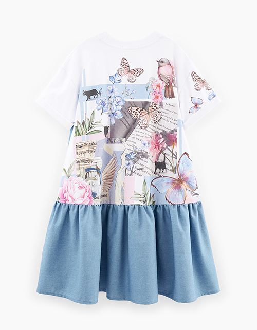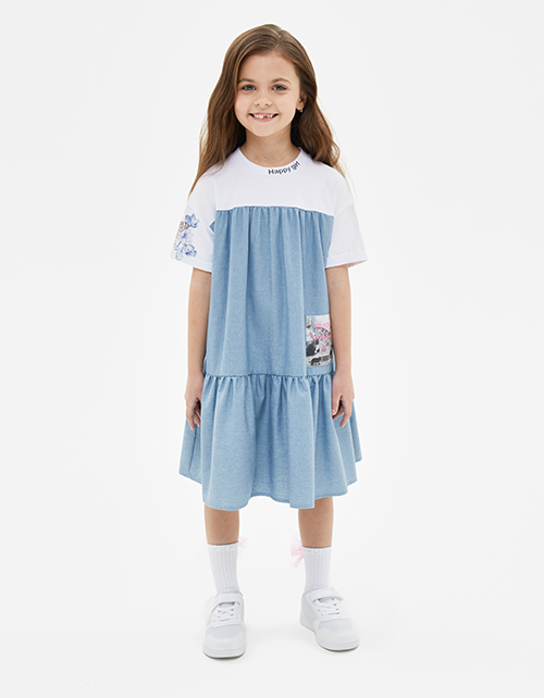 Романтичное платье с коротким рукавом для девочки. Модель комфортного трапециевидного силуэта. Спущенная линия плеча. Рукава с манжетами. Комбинация материалов: джинс и кулирная гладь. Платье декорировано авторскими принтами и лэйбой. Ткань изделия: джинс; трикотажное полотно кулирная гладь