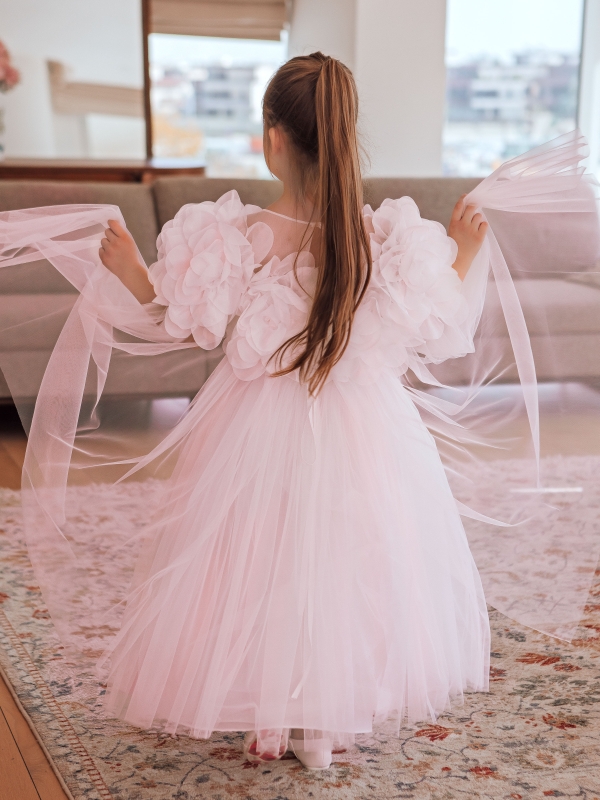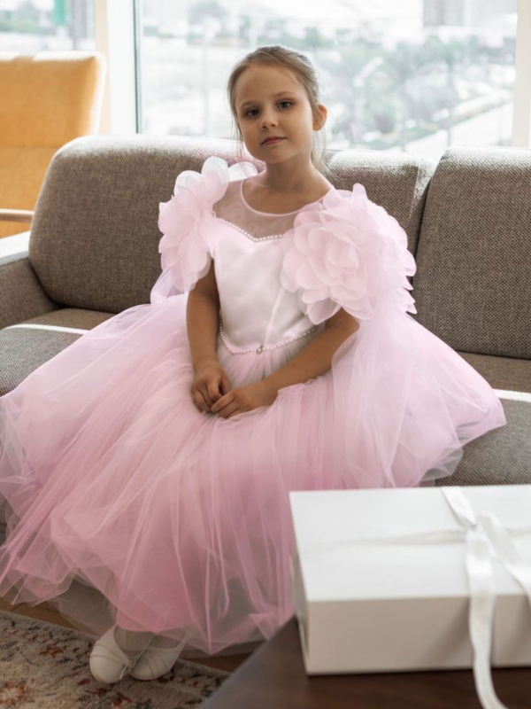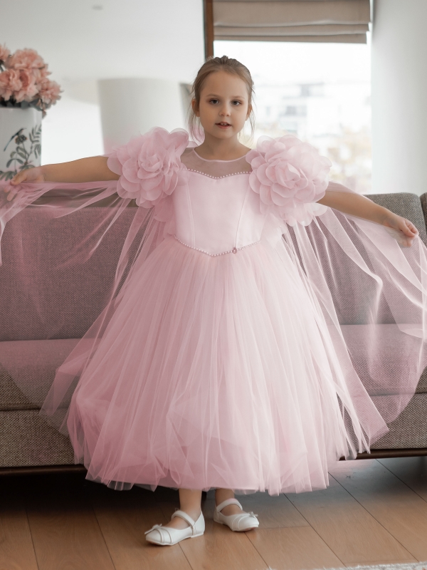 Нарядное платье для девочки в нежно-розовом цвете с корсетными косточками спереди. Коллекционная модель премиального бренда подчеркнет красоту и изящность вашей принцессы. Платье выполнено из высококачественных материалов.Мягкий еврофатин аккуратно собран в 4 слоя в пышную юбку, рукава собраны в объмные цветы (ручная работа) и также выполнены из еврофатина, нежно прикрывают плечи ребенка, переходя в летящий шлейф. Платье полностью на хлопковом подкладе. Все швы обработаны, что позволяет девочке чувствовать себя комфортно весь праздник. Перед платья в стиле "принцесса" с мысиком по груди и талии. Украшено по швам полужемчугом. Сзади платье на корсетной шнуровке. Статусное платье на выпускной, свадьбу, выступление, фотоссесию. Изящная модель на важную дату.