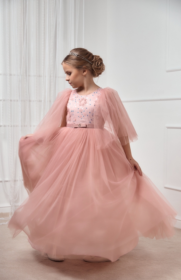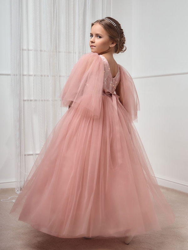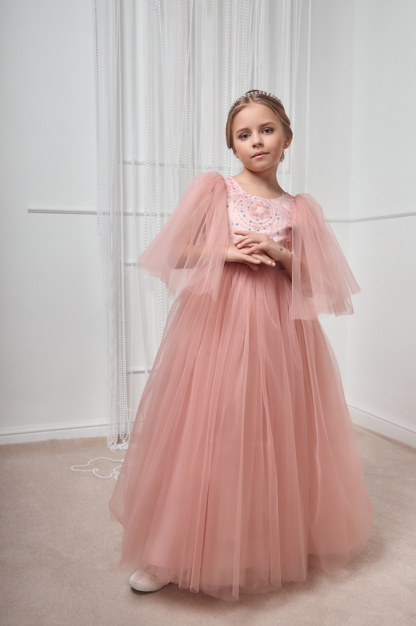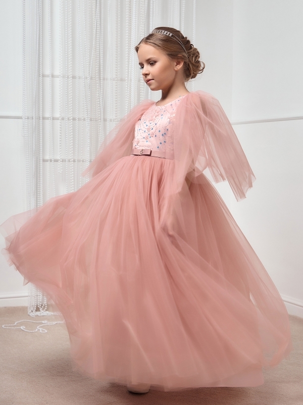 Нарядное платье для девочки в цвете пудра. Коллекционная модель премиального бренда подчеркнет красоту и изящность вашей принцессы. Платье выполнено из высококачественных материалов. Мягкий евро-фатин аккуратно собран в пышную юбку, рукава также выполнены из евро-фатина с открытым срезов и нежно прикрывают плечи ребенка. Платье полностью на хлопковой подкладке. Все швы обработаны, что позволяет девочке чувствовать себя комфортно весь праздник. На полочке ручная вышивка узора с пайетками. Статусное платье на выпускной, свадьбу, выступление, фотоссесию.