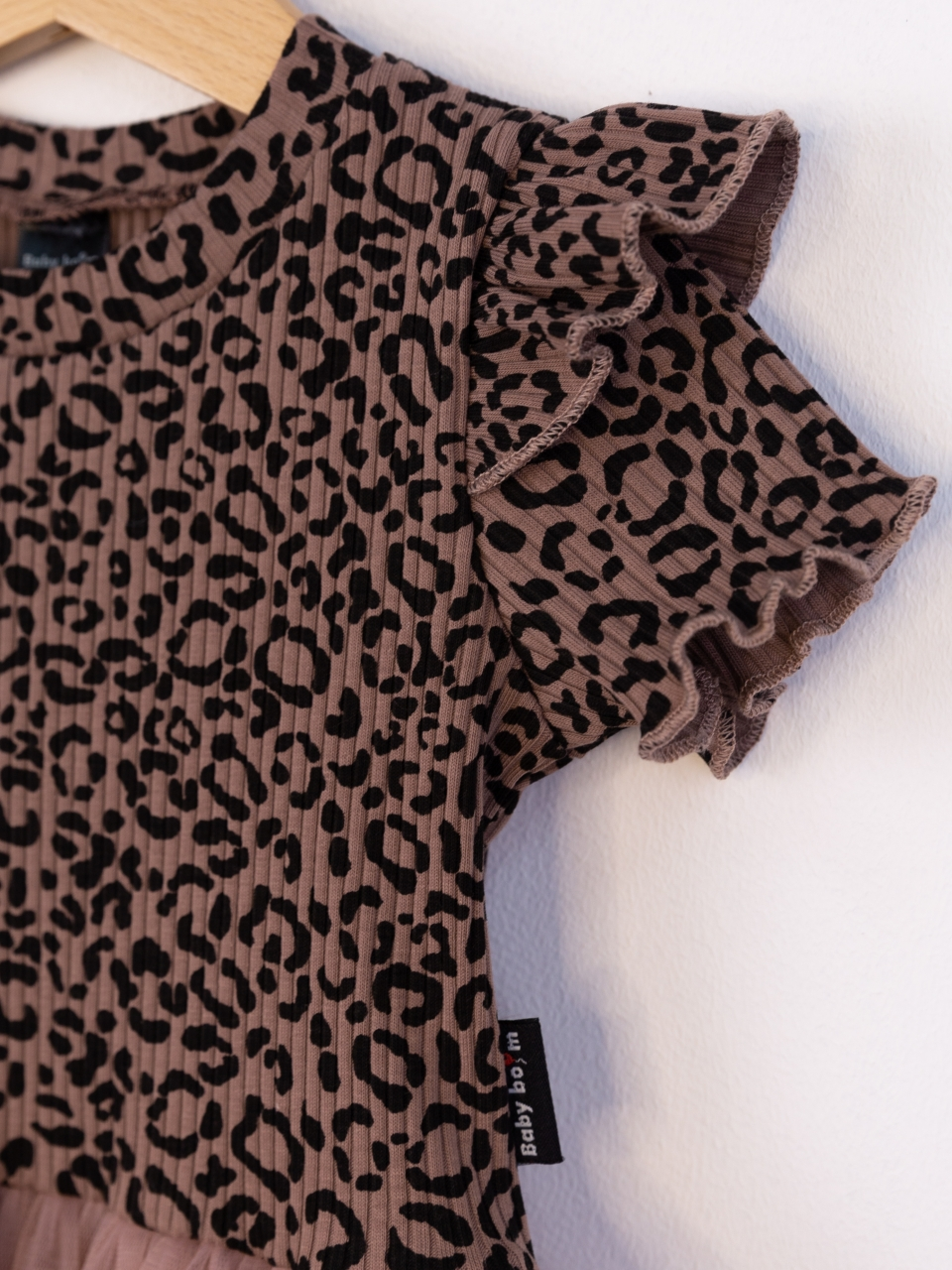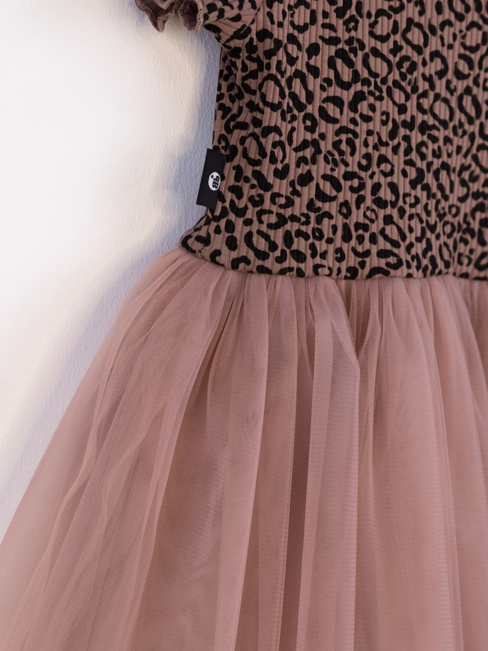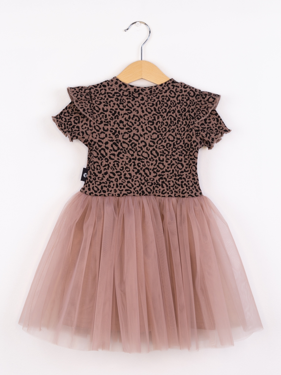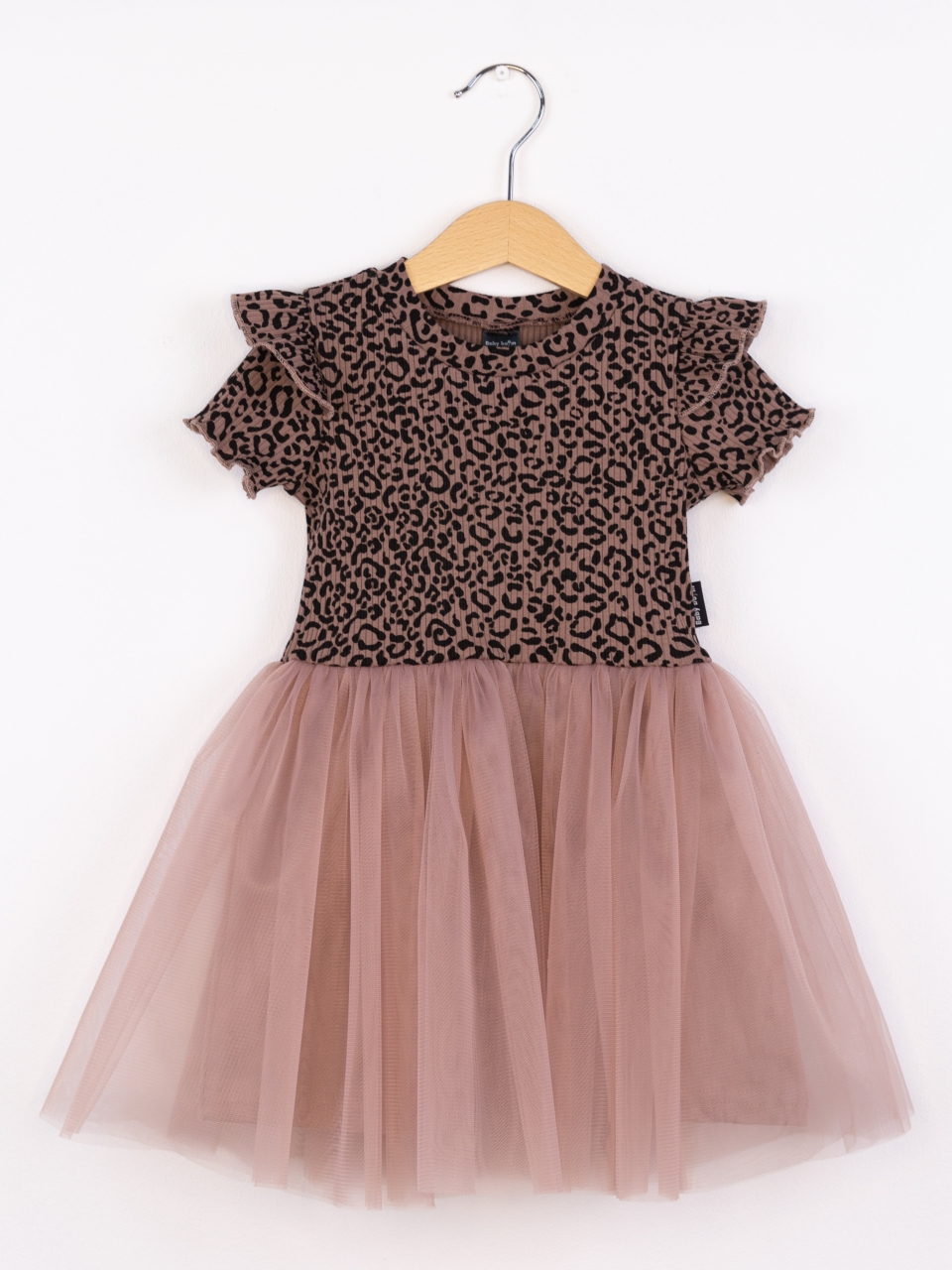 Нарядное платье с короткими рукавами, крылышками и пышной фатиновой юбочкой. Верх выполнен из кашкорсе-лапша (95% хлопок, 5% эластан), подкладка юбки из кулирки (100% хлопок). Мягкая юбочка из фатина кофейно-пудрового цвета элегантно подчеркивает талию. Платье невероятно комфортное, без застежек, простое в использовании.