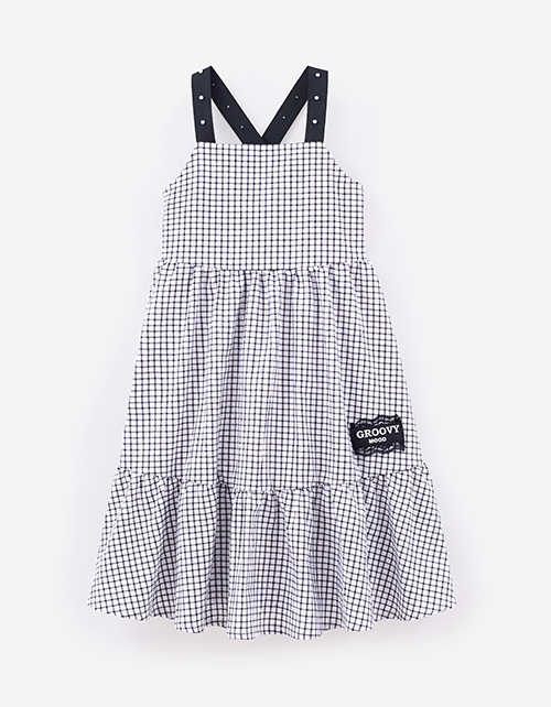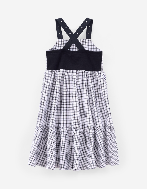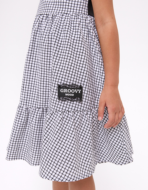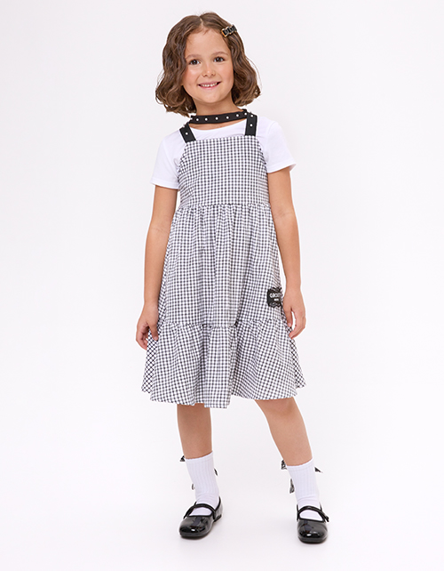 Сарафан в клетку на бретелях создаёт лёгкий, расслабленный образ. А?силуэт и жатая сорочечная ткань добавляют воздушности. Кружево на лэйбе и репсовая тесьма создают аккуратный декоративный акцент. Ткань изделия: сорочечная