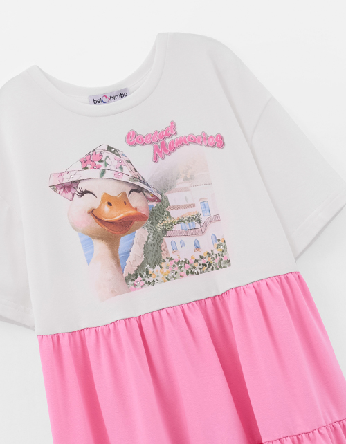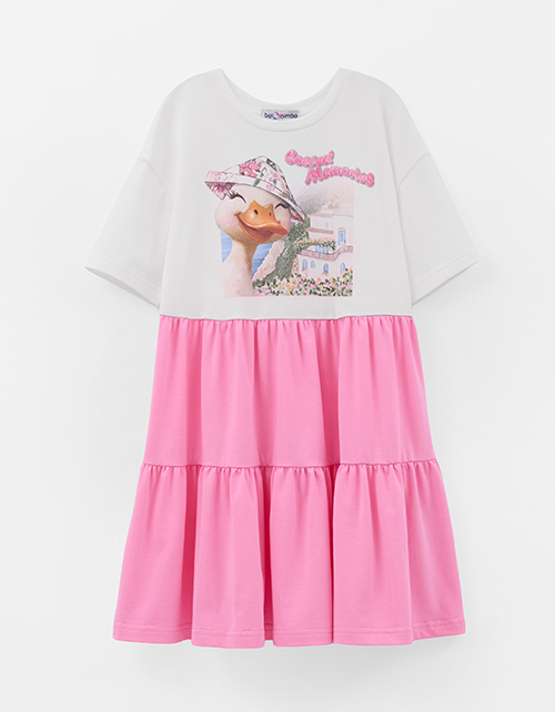 Платье А-силуэта из мягкого хлопкового трикотажа. Каскадная юбка создаёт лёгкое, воздушное движение. Короткий приспущенный рукав добавляет расслабленности. Авторский цифровой принт и стразы делают образ ярким. Мягкая рибана по горловине. Ткань изделия: трикотажное полотно кулирная гладь