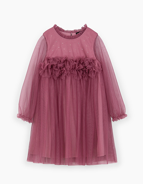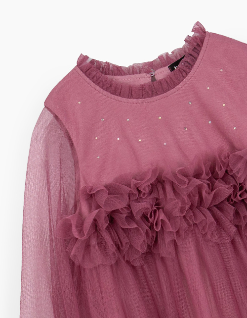 Нежное и летящее нарядное платье благородного брусничного оттенка для девочки. Комфортная трапециевидная модель с фантазийными рукавами. Платье с застёжкой на пуговицу. Изделие декорировано стразами и декоративной рюшей по кокетке. Ткань изделия: трикотажное полотно кулирная гладь