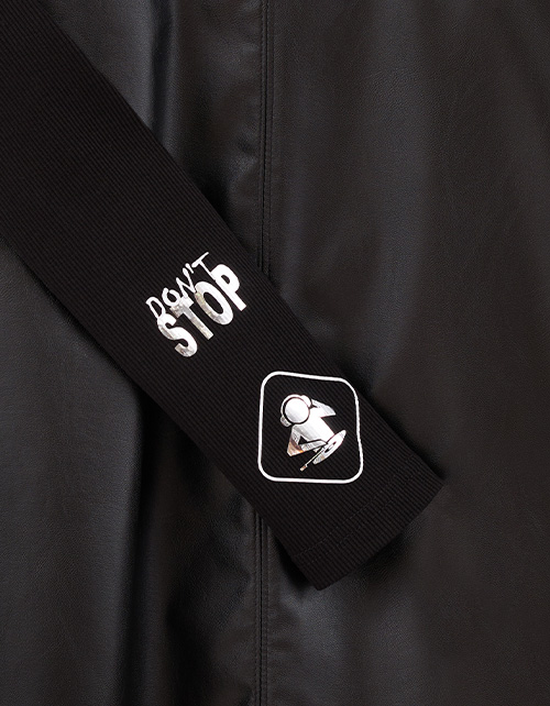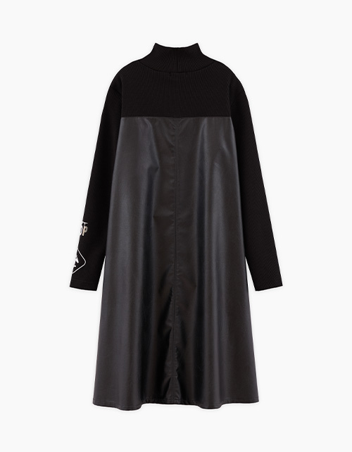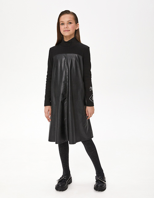 Стильное чёрное платье для девочки. Комфортный А-образный силуэт. Спущенная линия плеча. Воротник-стойка. Имитация комплекта гольфа из рибаны в рубчик и сарафана из эко-кожи. Лаконичный авторский декор. Ткань изделия: трикотажное полотно рибана; кожзаменитель
