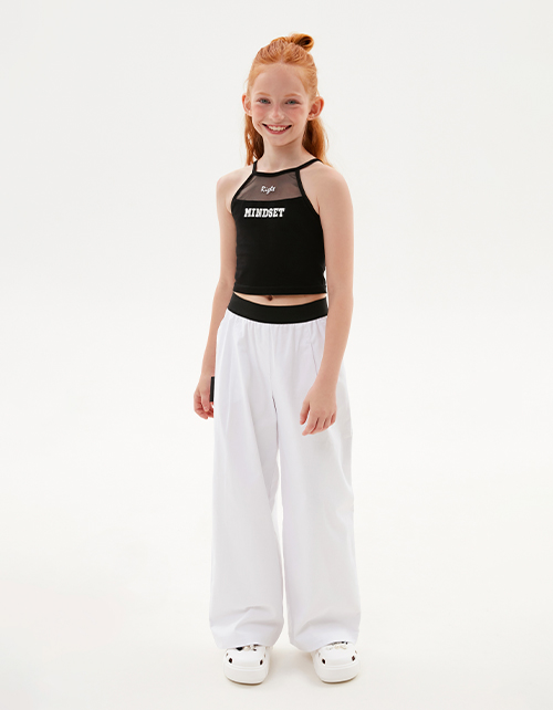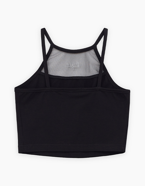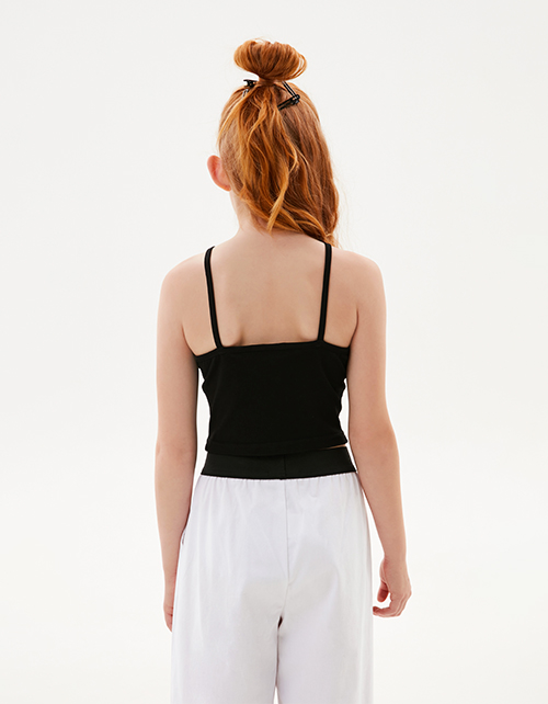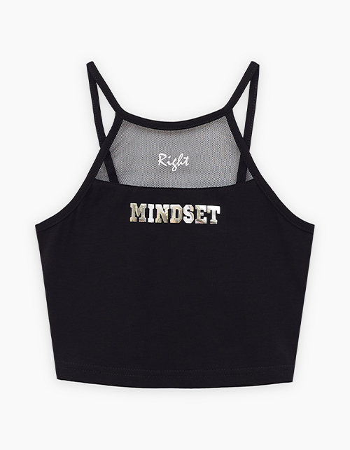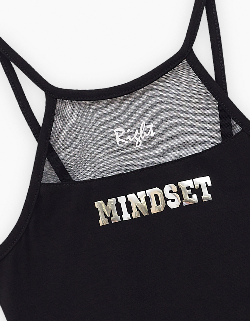 Чёрный топ для девочки. Модель прилегающего силуэта. Комбинация материалов: мягкая сетка и кулирная гладь. Топ с оригинальной спинкой декорирован авторским шрифтовым принтом.
